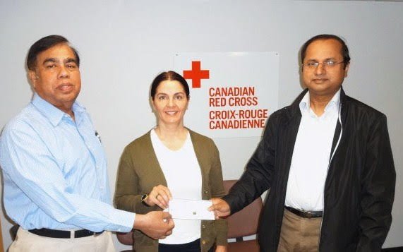 The Canadian Redcross accepting a donation of $5000 from the Bangladesh Canadian Association of Edmonton (BCAE). President-Shajjad Khondoker and Vice President, Moh. Laskar of BCAE handing over the cheque to Redcross.